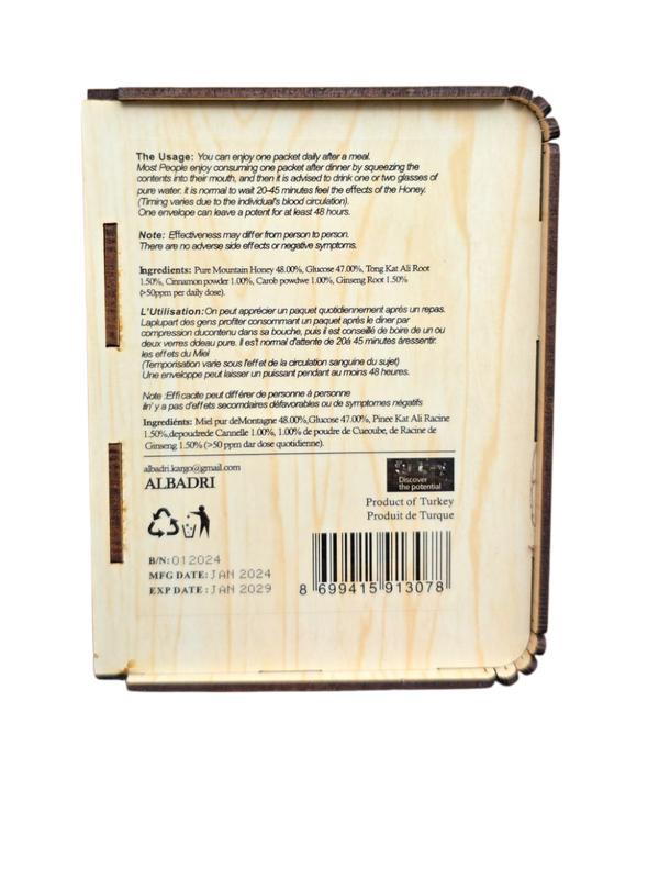 - Ingredients: Ingredients: Pure Mountain Honey 48.00%, Glucose 47.00%, Tong Kat Ali Root 1.50%, Cinnamon powder 1.00%, Carob powdwe 1.00%, Ginseng Root 1.50%, and Sildenafil.