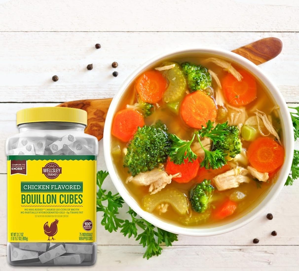 Bring rich, savory flavor to your favorite soups, stews, sauces, and rice dishes with Wellsley Farms Chicken Flavored Bouillon Cubes. Each cube delivers authentic chicken taste that enhances any recipe — simply dissolve one cube in hot water for instant, delicious broth.